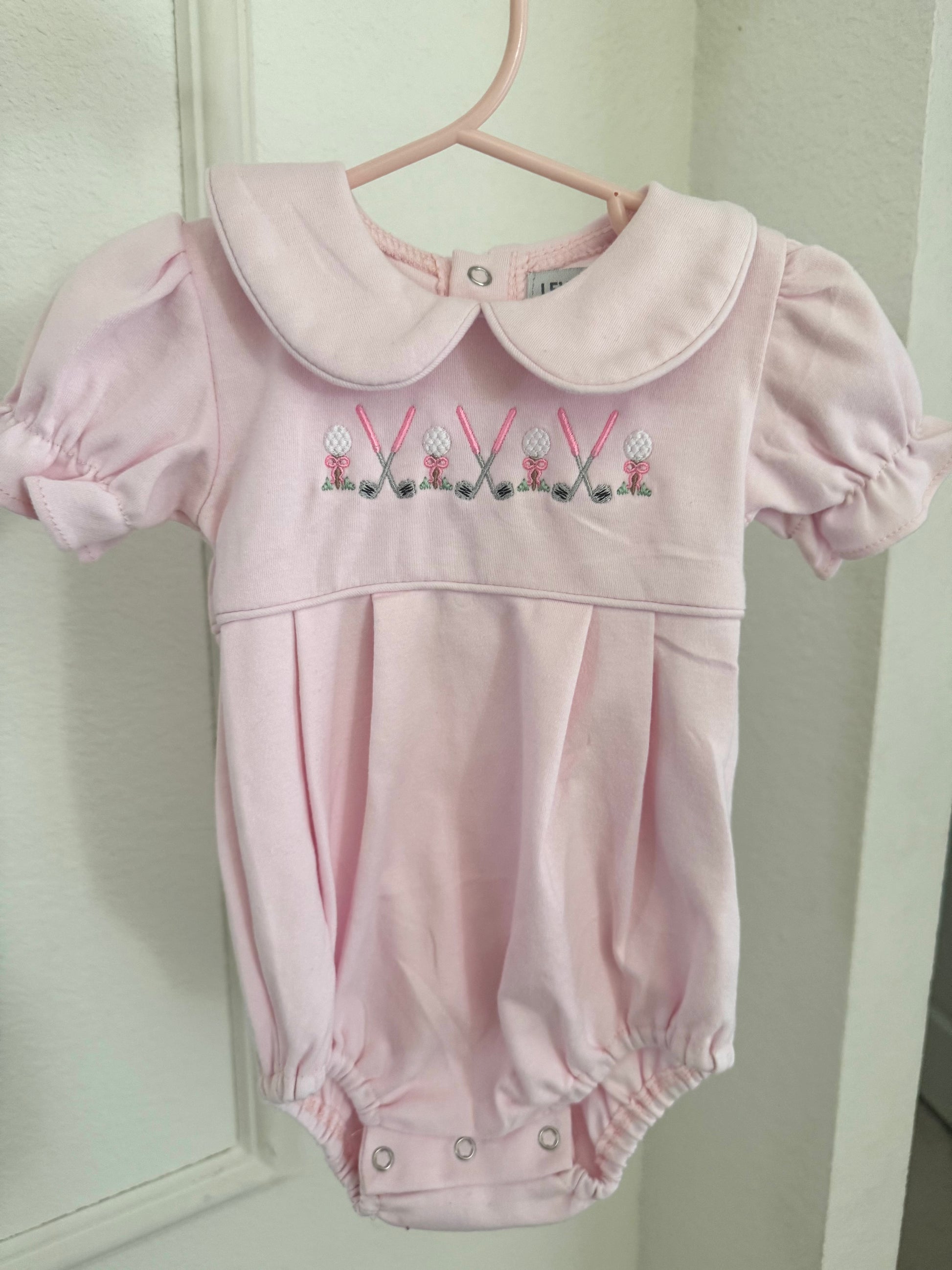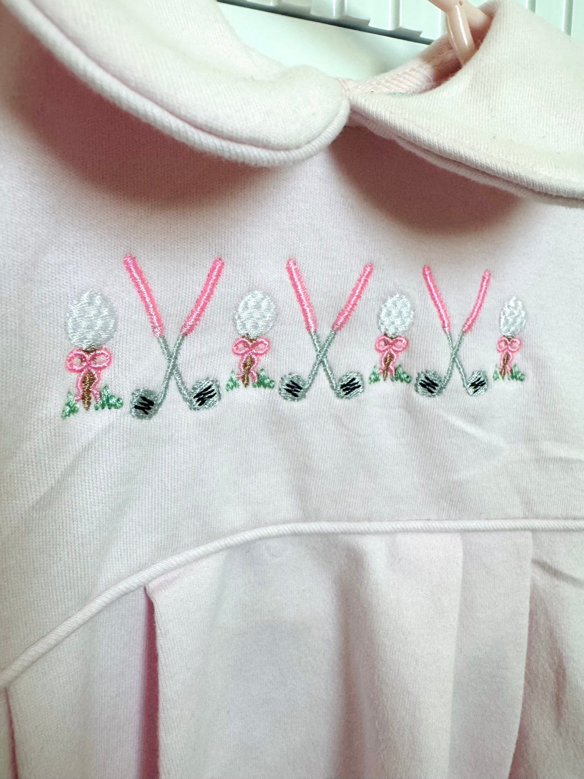 100% cotton, light pink, and embroidered golf bubble. Perfect for little girls with daddies that love to golf!