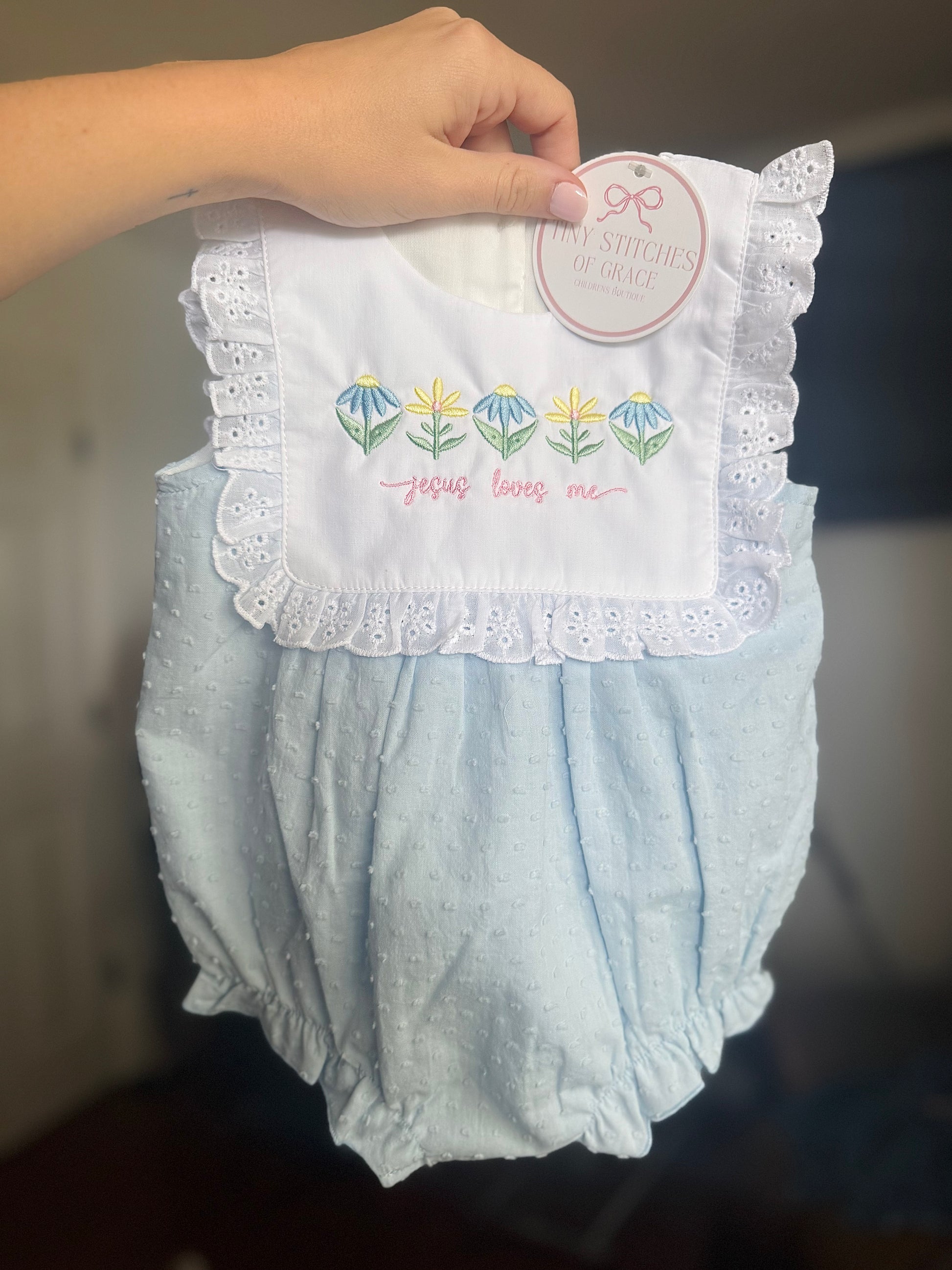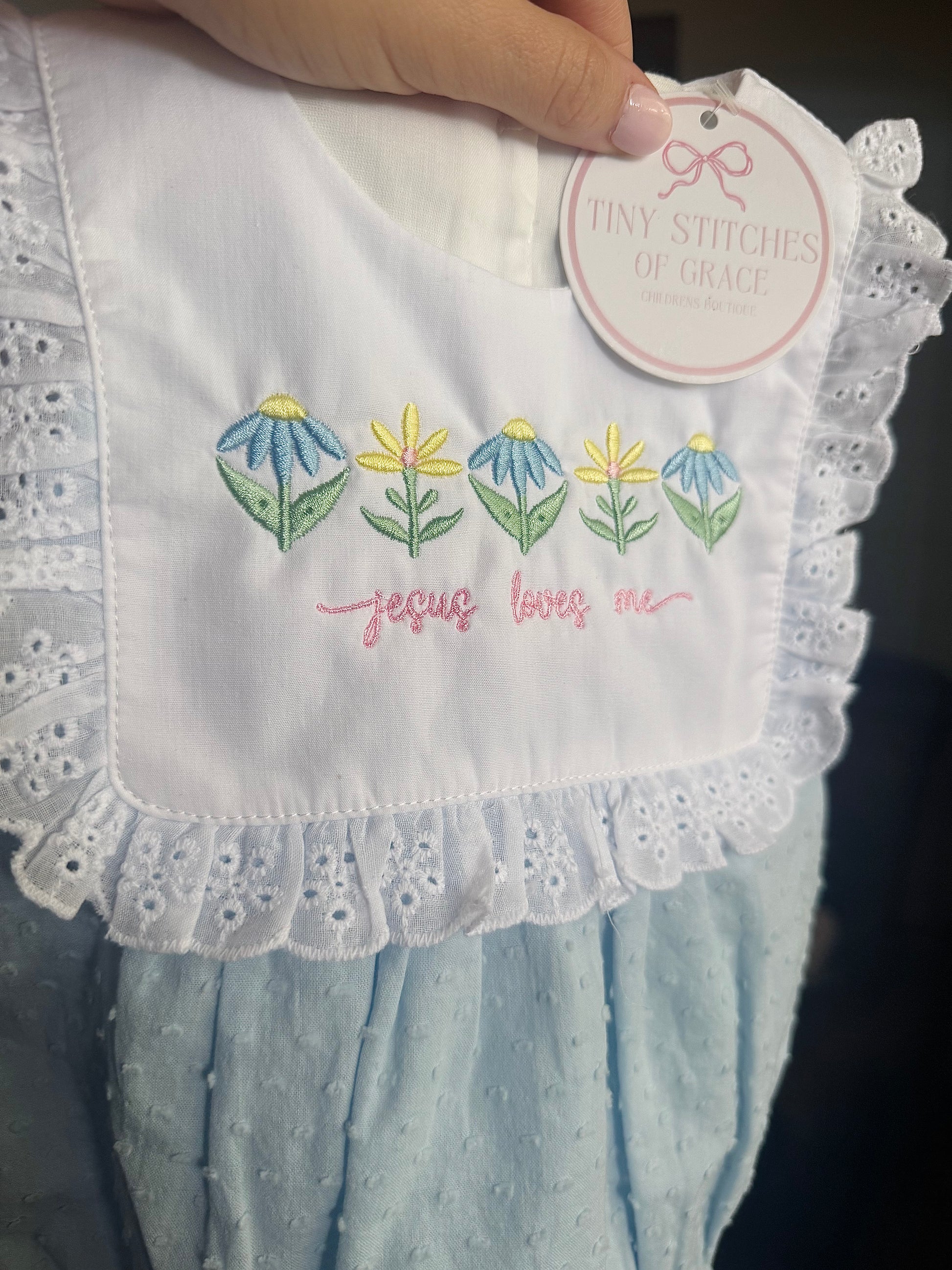 The prettiest blue Swiss dot bubble adorned in embroidered florals and the sweetest reminder that we are loved by Jesus :)